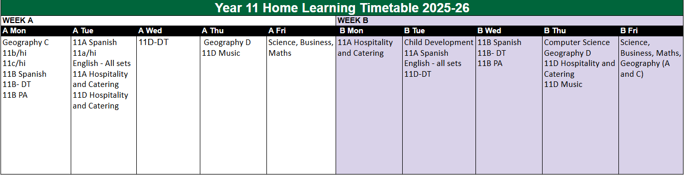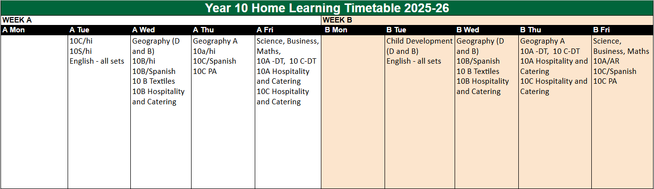 For Years 10 - 11, examination subjects will set one Home Learning task per week.  Each will take up to 60 minutes to complete.